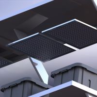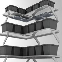 I caulked the seams in the shelves, braced them with rectangles I cut off a door jamb and painted the whole thing grey just to bring it all together. You can see from my 3D models the basic layout I am planning for. The shelves revolve around two sizes of bucket. A 5 gallon Husky brand tote, seen filling the lower two shelves. And a shorter 5 gallon HDX brand tote, seen populating the top shelf.