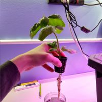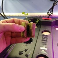 I started with the oregano, uprooting a few strong shoots doing my best to leave as much of the root system intact as possible. I rinsed the roots under luke warm water, soaked, rinsed etc. to remove as much soil trapped in the roots as possible. I then individually placed them each in rockwool cubes; ensuring the roots hung well below the netpot and the collar kept a good hold on the stem of the plants. I repeated this for two whole basil plants. I used whole basil plants instead of cuttings because I have an excess of basil and want to make room for new mothers of other species.