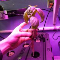 For the dill, I took three of the tallest cuttings I could, using sanitized scissors, and plugged them in so that the freshly cut stems plunged well in to the fog. I would have liked to apply rooting solution to these stems, but for now I do not have any. I noted that after plugging in the dill their branches wilted markedly and rapidly, slumping over within ten minutes. They seemed to wilt to a certain extent quickly then cease. I believe they will need a recovery period.
